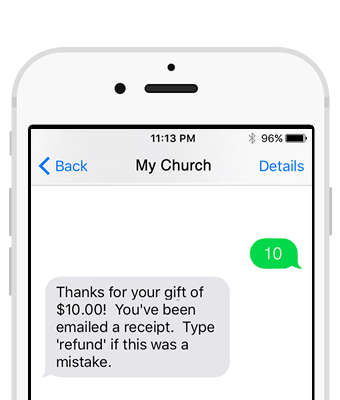 | give | Your text giving number will respond asking “how much you’d like to give”. Telling people to text ‘give’ to your number can be a more succinct way to communicate text giving. |